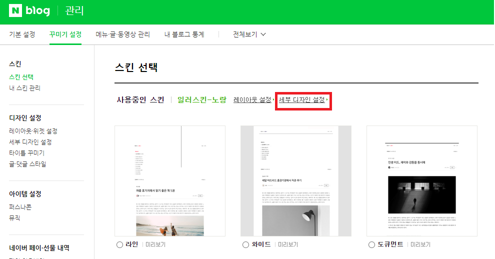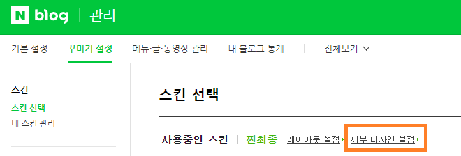 위 레이아웃을 참고해서 위젯 디자인한 결과물을 포토샵 혹은 일러스트레이터에서 작업하고 결과물을 JPG파일로 웹용저장을 하면 준비가 됩니다. 다시 블로그 관리메뉴에서 꾸미기 설정 - 세부디자인 설정을 클릭해줍니다.