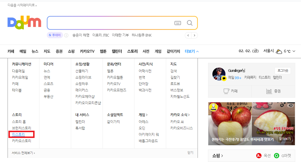 02. 더보기를 누르고 티스토리 메뉴를 클릭하세요.