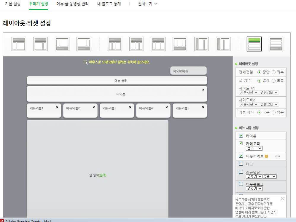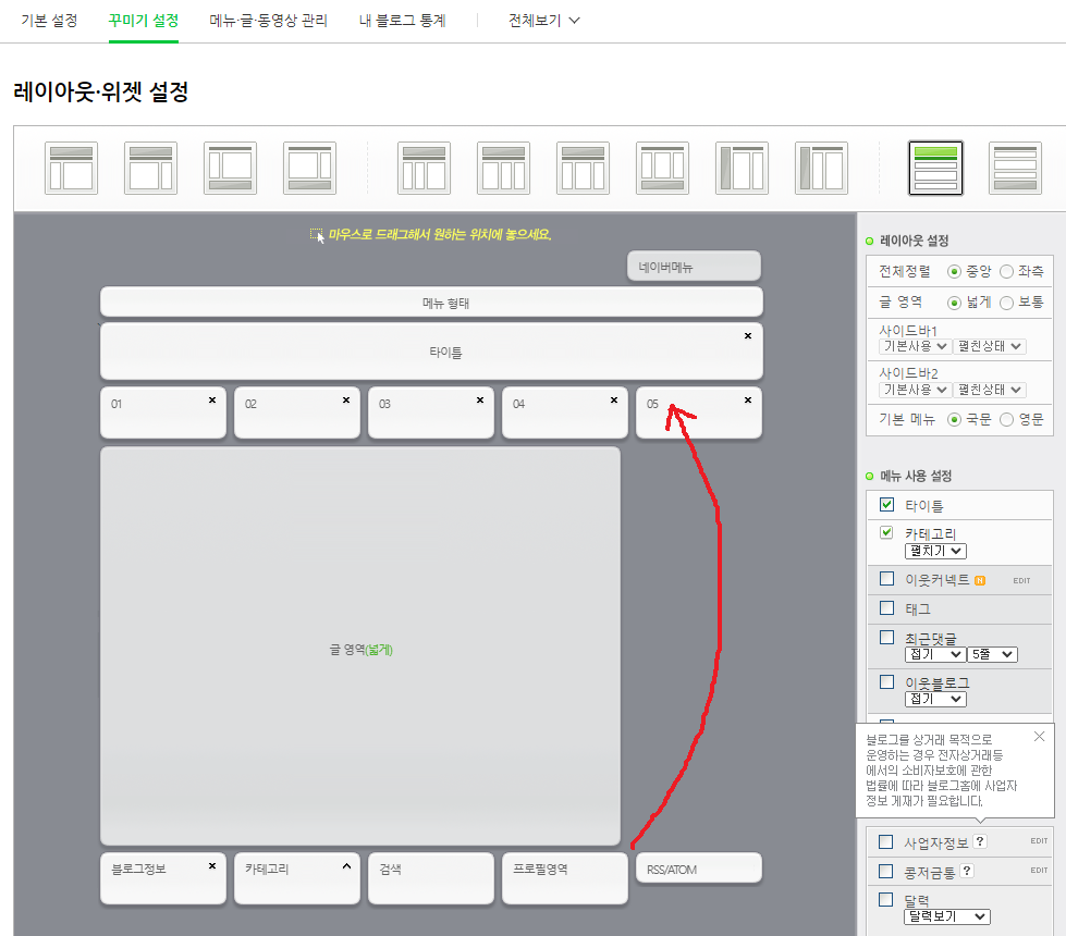 04. [ 레이아웃 위젯 설정 ]에서 우측의 넓은 레이아웃을 선택합니다. 위젯 삽입이 최적의 레이아웃이기 때문입니다.