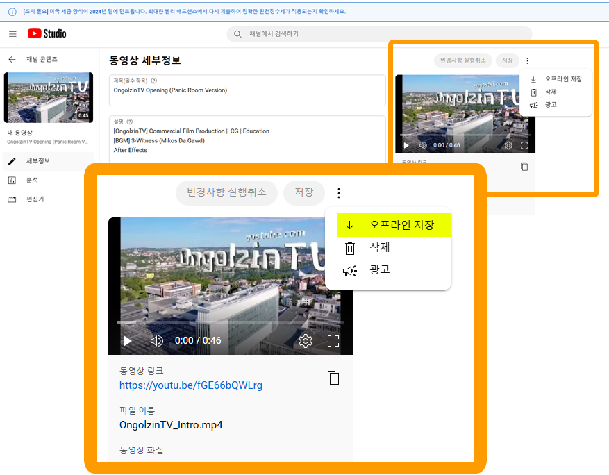 유튜브에 업로드한 영상은 [동영상 수정] 을 통해 스튜디오로 접근하여 별도 [오프라인 저장]을 할 수 있습니다. 동영상 업로드가능하지만 재활용도 가능하다는 것이다. 포폴은 20초의 영상들을 모아서 1분 30초 정도의 영상으로 최종 모아서 컬렉션 영상으로 제출(업로드)해서 보여주는 것입니다.
