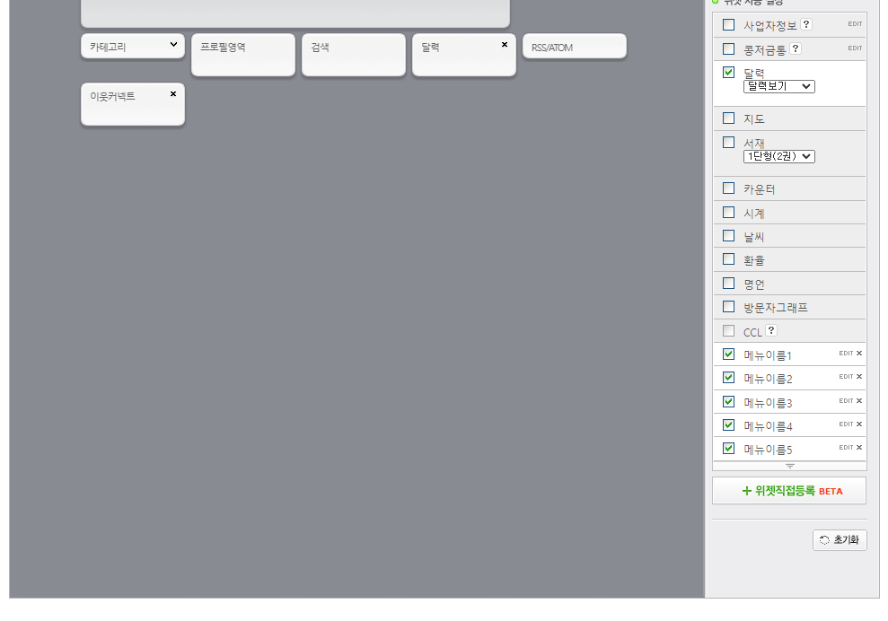 05. [ 레이아웃 위젯 설정 ]에서 우측 하단의 구성요소 중 +위젯직접 등록 버튼이 위젯을 등록하는 것입니다. 5개 정도가 미리 등록이 된 그림입니다.