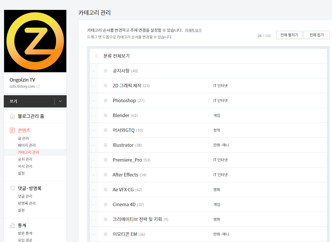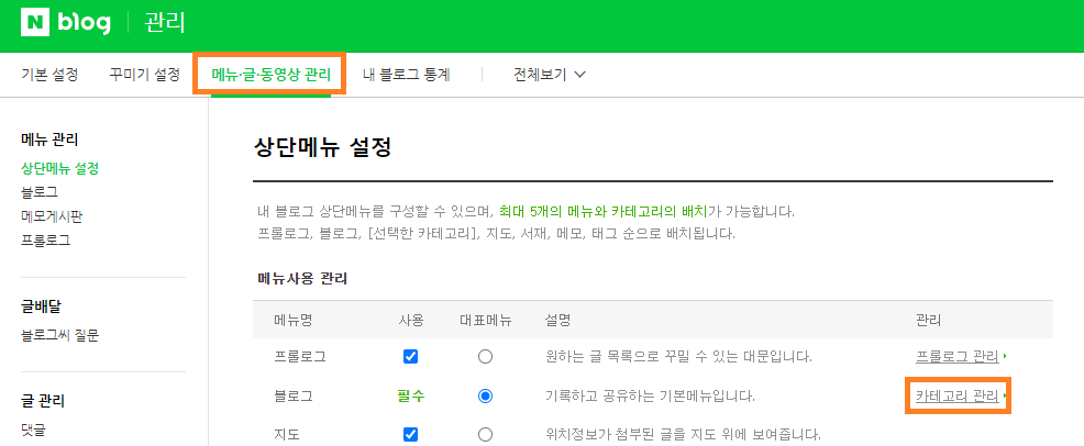 [ 메뉴 글 동영상 관리] 메뉴에서 우측의 카테고리 관리를 누르고 게시판 카테고리를 추가 및 수정해야 합니다. 블로그를 생성하면 기본 게시판 1개만 주기 때문에 목적에 맞게 추가합니다.