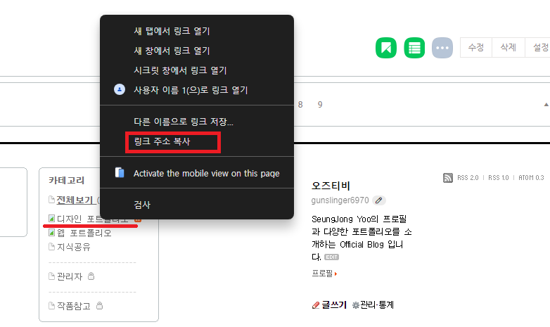 우선, 여러분의 블로그의 프로필, 추가된 공개목적의 카테고리 링크 주소를 아래와 같이 링크되는 메뉴이름에서 우클릭하고 [ 링크주소 복사]를 누른 후, 별도 메모장 TXT파일에 붙여 놓으세요. 4개정도의 카테고리를 포함한 내부 연결 URL을 01 / 02 / 03 / 04 와 같은 구분으로 이름을 주고 붙이기를 해줍니다. 엔터키를 치며 서로 섞이지 않게 구분을 잘해서 준비를 해야 합니다.
