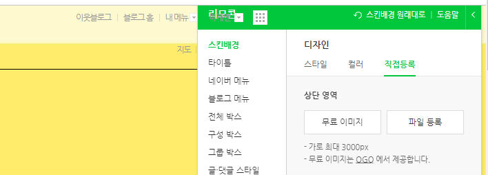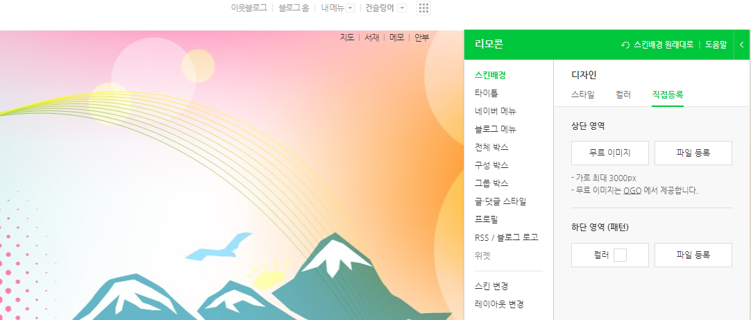 첫번째 항목인 [스킨배경]에서 여러분이 디자인한 스킨배경을 [직접등록]을 누르고 파일등록에서 JPG파일을 찾아서 등록을 하면 위젯과 연결되는 기능이 구현되는 것입니다.