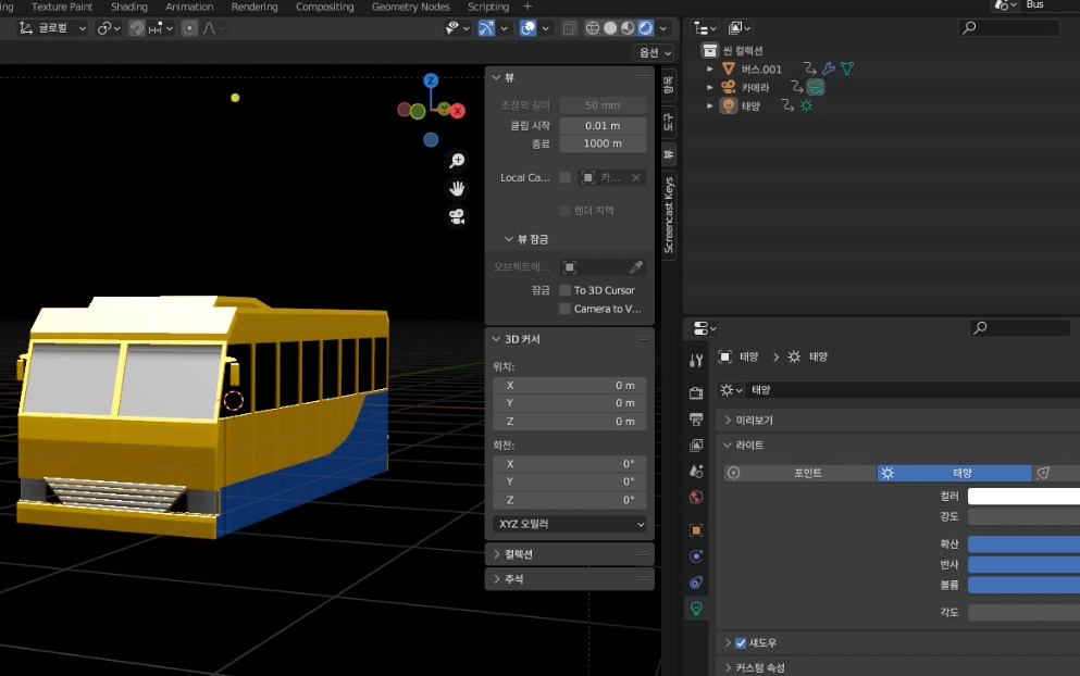 현재 블렌더 파일은 프로젝트파일입니다. 기본 컬렉션 하나에 카메라, 조명 외에 다양한 모델링 소스들을 추가해서 집에서 형상들을 모델링으로 만들어 움직이는 영상과 이미지를 만드는 것입니다.
