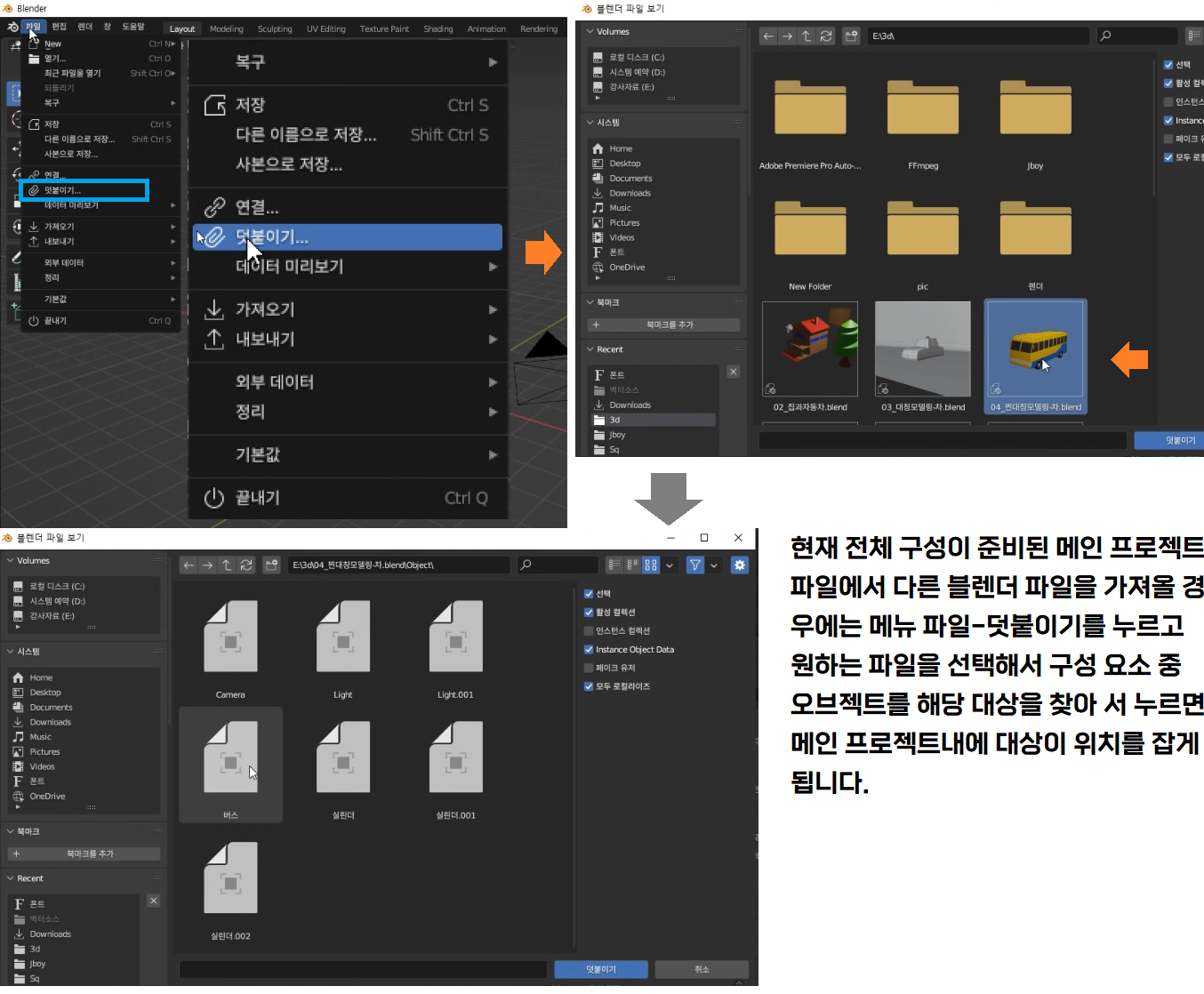 현재 전체 구성이 준비된 메인 프로젝트 파일에서 다른 블렌더 파일을 가져올 경우에는 메뉴 파일 - 덧붙이기를 누르고 원하는 파일을 선택해서 구성 요소 중 오브젝트를 해당 대상을 찾아 서 누르면 메인 프로젝트내에 대상이 위치를 잡게 됩니다.