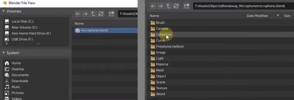 각각의 블렌더 파일 house.blender 와 같은 파일확장자는 본래 영상편집 및 모션그래픽 프로그램보다 더 복잡한 프로젝트파일의 압축판입니다. 개별 블렌더 파일들은 카메라, 조명, 오브젝트들로 이루어진 여러분의 집과 같습니다. 이러한 블렌더 프로젝트파일들 중 필요한 컬렉션, 오브젝트 등을 판단해서 가져와 현재 작업하는 메인 프로젝트 파일에서 작업을 해야하는 경우에는 어떻게 할까요? 필자의 경우 별도로 2개의 블렌더 프로그램을 실행하고 양쪽에 원하는 필요한 만큼 복사해 붙이는 방법도 많이 사용합니다.