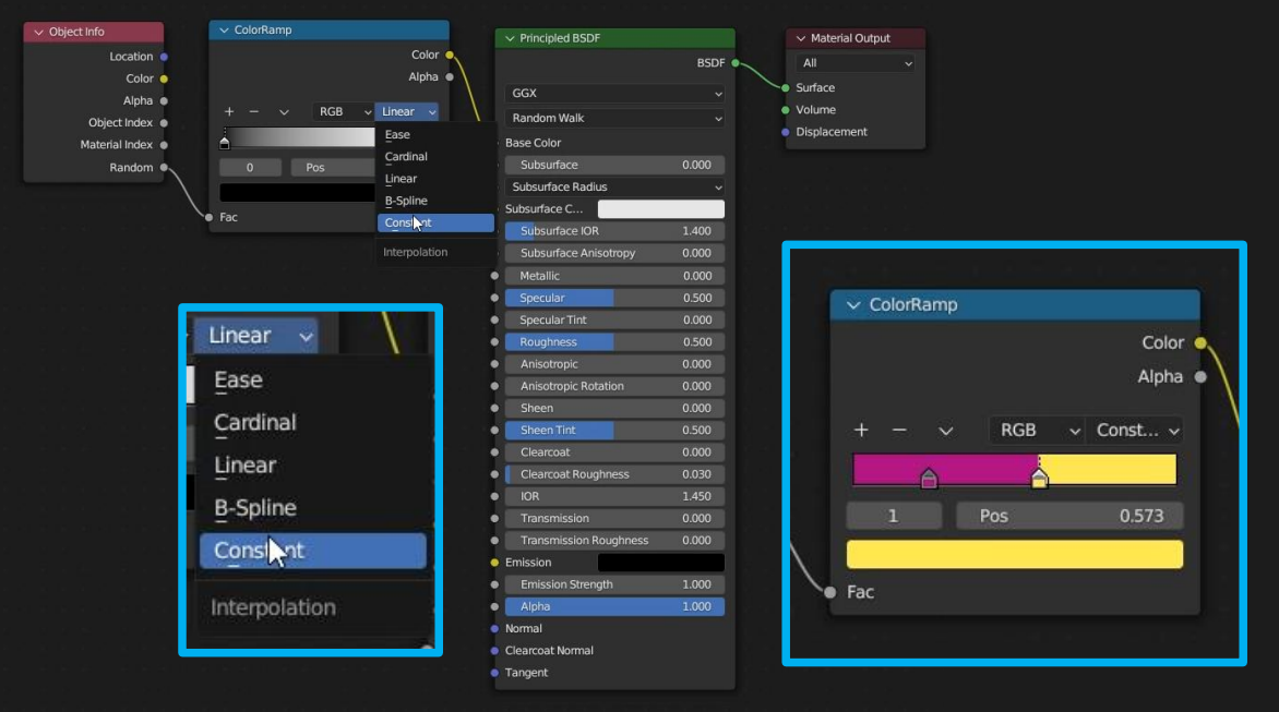 03. RGB를 Linear에서 Contant로 변경하고 그림과 같이 컬러핀을 2개의 색상으로 바꿔보세요.