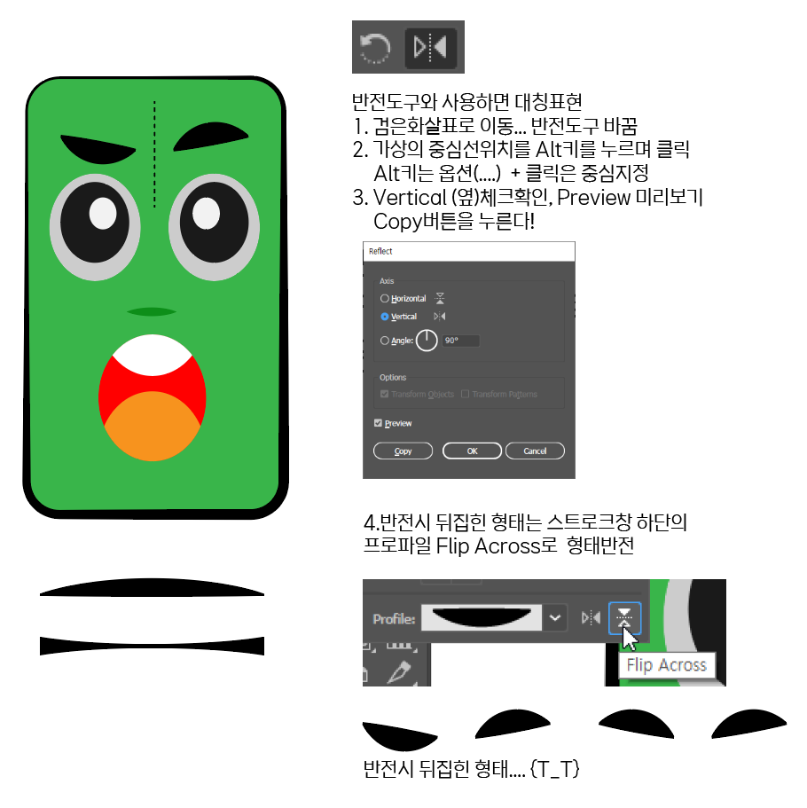 리플렉션도구로 좌우대칭복제를 위해서 선택한 대상에서 중심부분을 Alt키를 누르면서 지정을 하면 옵션창에서 Copy를 통해 복제가능하다!