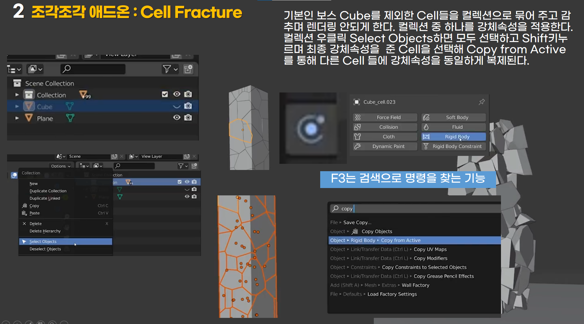 기본인 보스 Cube를 제외한 Cell들을 컬렉션으로 묶어 주고 감추며 렌더링 안되게 한다. 컬렉션 중 하나를 강체속성을 적용한다. 컬렉션 우클릭 Select Objects하면 모두 선택하고 Shift키누르며 최종 강체속성을 준 Cell을 선택해 Copy from Active 를 통해 다른 Cell 들에 강체속성을 동일하게 복제된다.