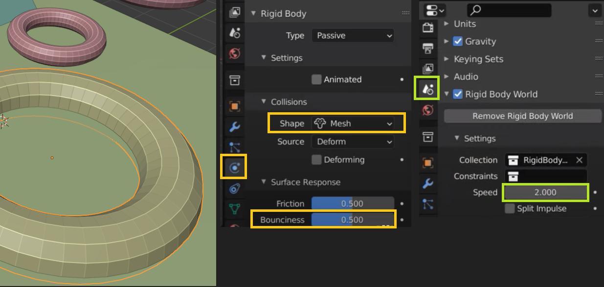 02. 추락하는 개체에 영향을 주는 바닥과 장애물 오브젝트에 Rigid Body를 체크하되, Collisions-Shape는 Mesh로 주고 탄성 Bounceness은 0.5 정도 준다. 씬의 속성에서 Speed 2.0정도 적용해 준다.