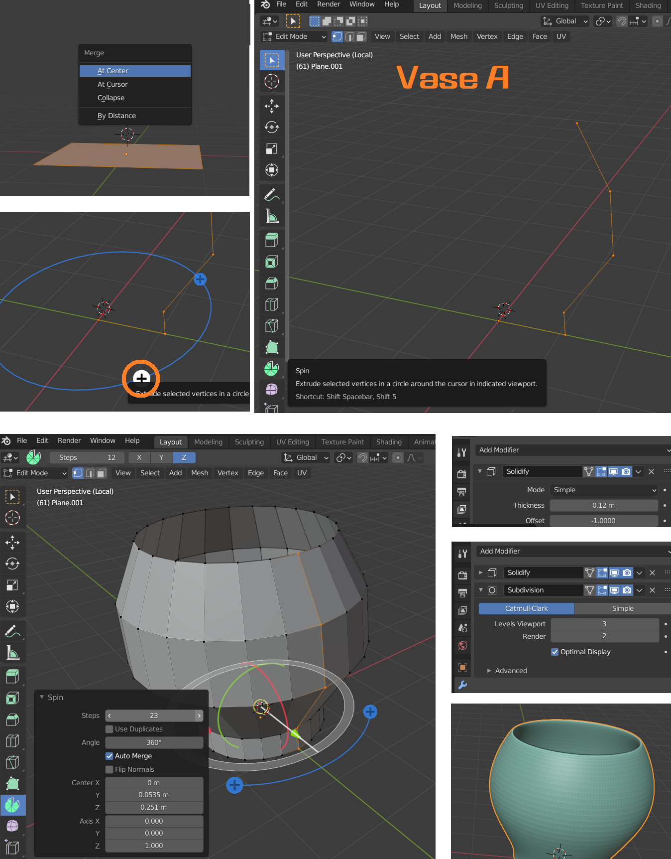 바닥에 평평한 판자로 활용하는 Mesh인 기본 Plane를 추가하세요. Alt+G로 중심에 물체를 배치하세요. Edit Mode에서 M을 눌러 Center로 점을 모으고, Spin 도구로 + 눌르고 입체면을 돌리면 형상이 쉽게 만들어 집니다. Object Mode에서 Modifier를 2개 추가합니다. 두께감을 주기위해 Soildify 추가후 0.12m정도, 부드럽게 Sub division Subface를 주면 도자기 형상을 쉽게 모델링할 수 있습니다.