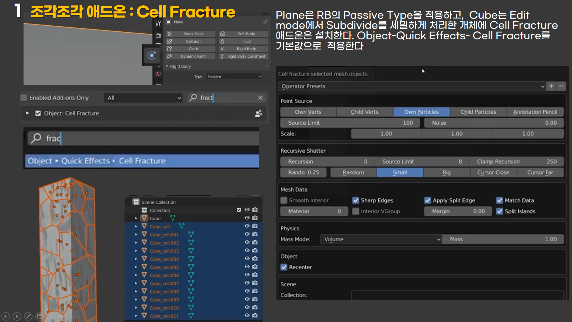 Plane은 RB의 Passive Type을 적용하고, Cube는 Edit mode에서 Subdivide를 세밀하게 처리한 개체에 Cell Fracture 애드온은 설치한다. Object-Quick Effects- Cell Fracture를 기본값으로 적용한다
