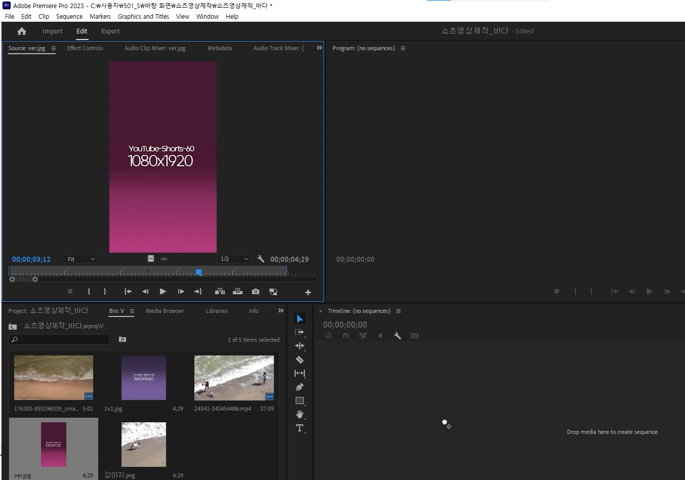 세로 혹은 1:1비율의 이미지를 소스창에서 확인하고 타임라인으로 드롭다운 하면 그 이미지 크기에 맞는 시퀀스를 자동으로 생성해줍니다. 이와 같은 방법으로 영상은 크기에 맞는 이미지를 준비해 시퀀스를 구성하면 원하는 크기의 영상을 쉽게 만들 수 있습니다.