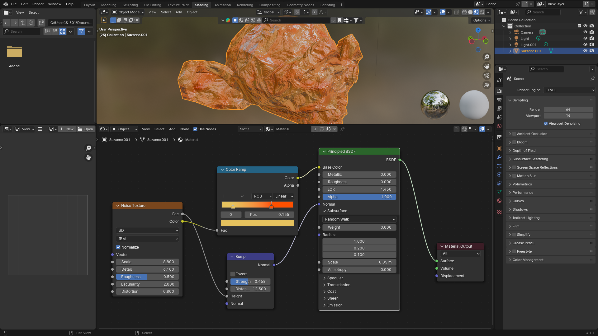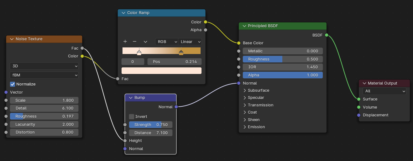 Noise Texture : 범프와 함께 추가하는 노드로 밀도와 세밀함을 노이즈를 통해서 세밀한 재질을 부가해서 줄 수있다. 범프의 시너지 재질이다. [▶Menual]