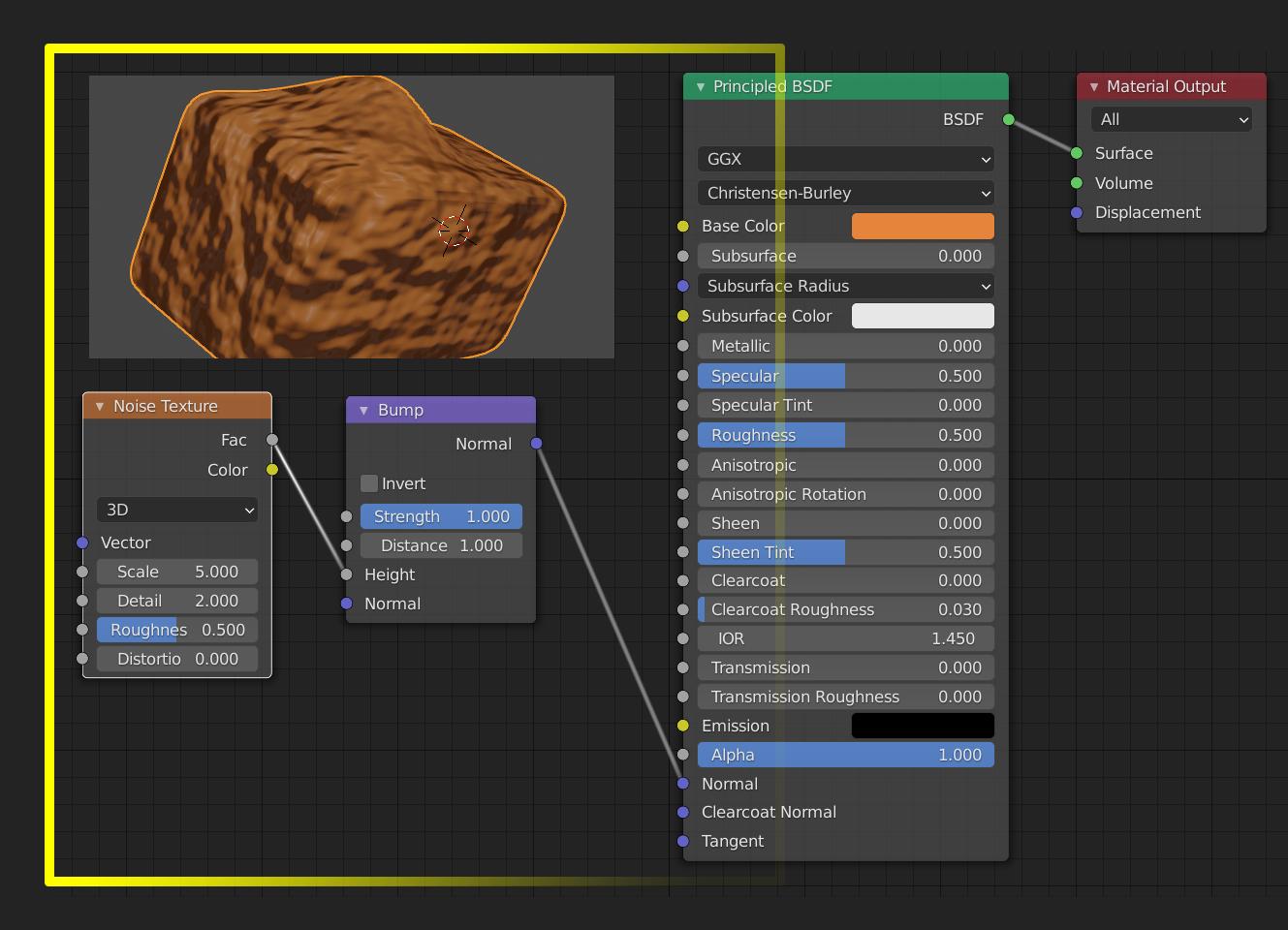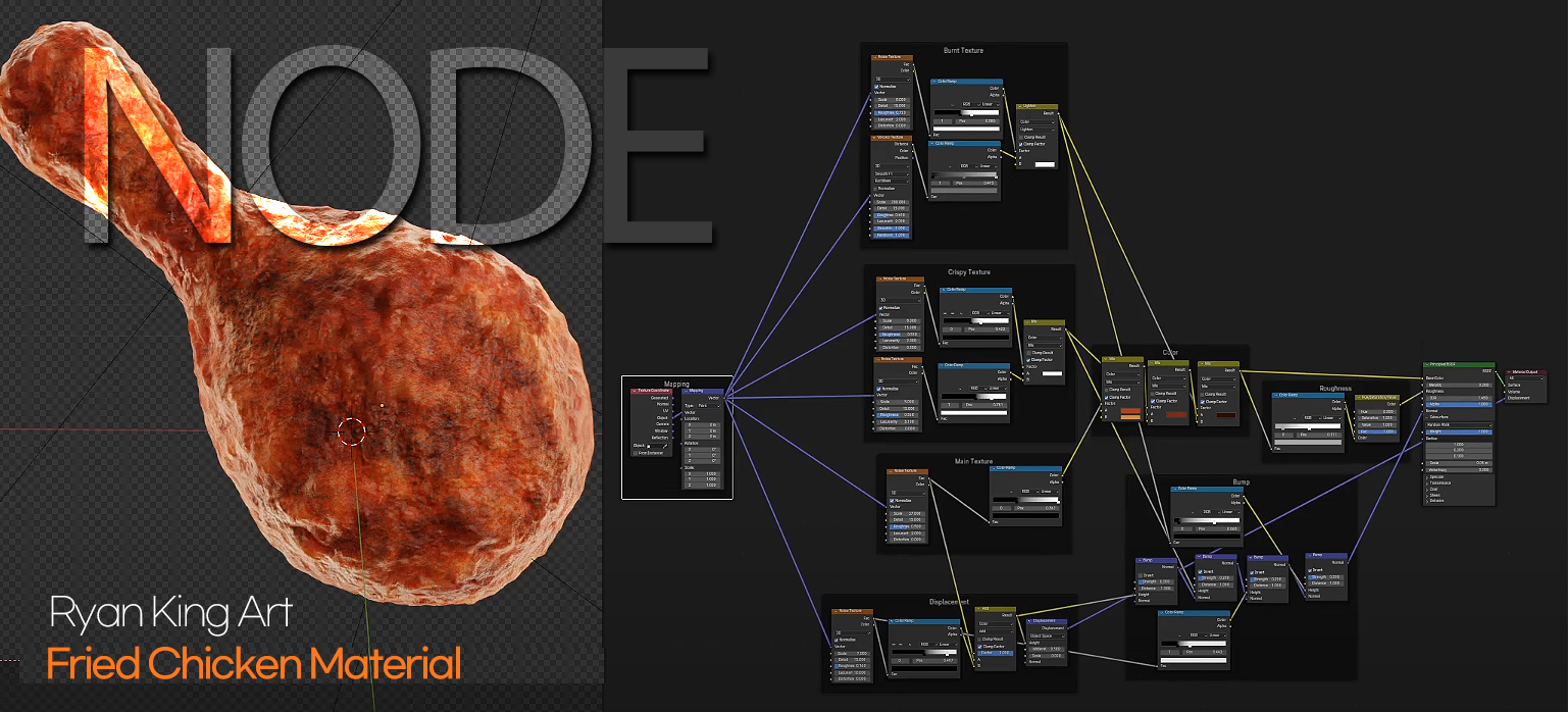 Blender Chicken 키워드로 조회수가 많은 아래 영상에서 방법으로 Displace Modifier를 이용하고 또 여기에 범프를 연결한 튜토리얼도 참고해보세요. 노드는 어떤 속성을 추가하고 값을 주는지 알고 해야하지만, 다른 여러 튜토리얼을 참고해 속성과 값의 변화를 주는 예들이 많습니다. 아래 영상은 어떤 형상이더라도 중요한 조명등의 주요표현을 배울 수 있는 사례입니다.