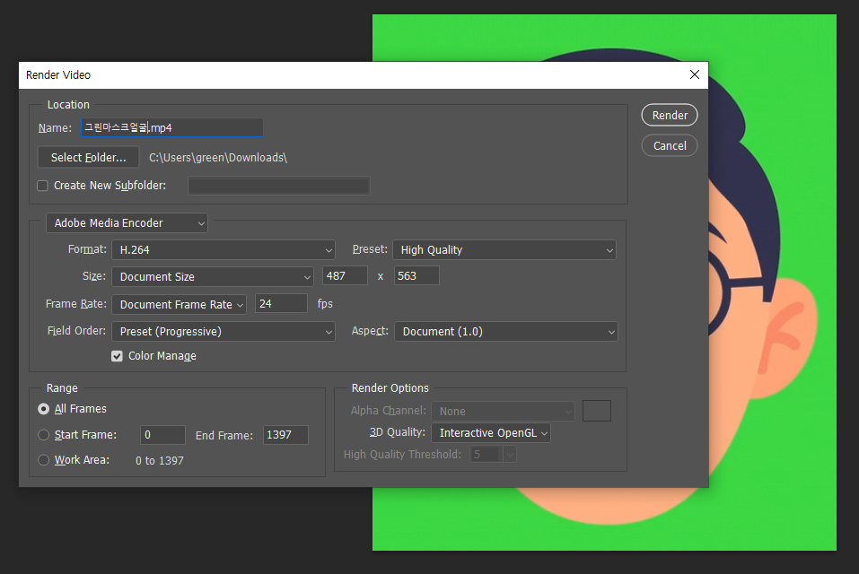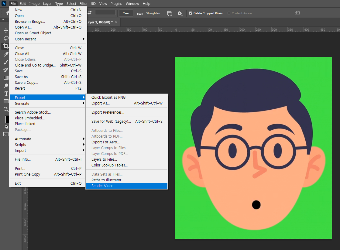 포토샵은 영상을 자르거나, 내가 원하는 크기로 줄여서 렌더링으로 내보낼 수 있습니다.