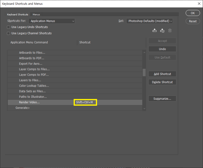 포토샵에서 Video File로 내보내기, 포토샵 단축키 지정