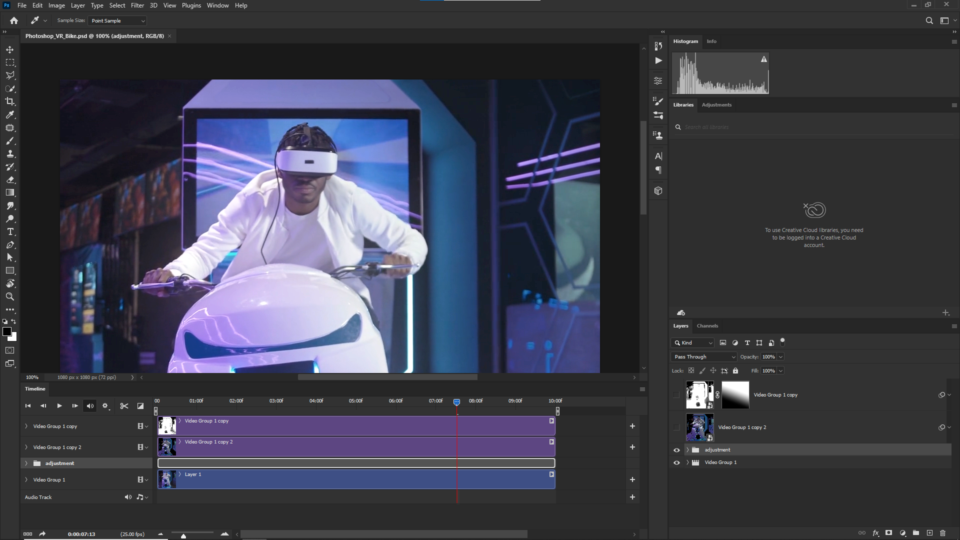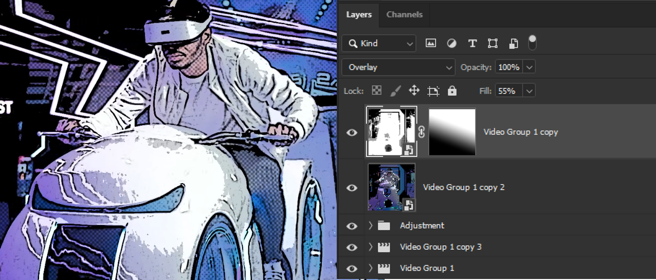 v포토샵에서도 WorkSpace를 Motion으로 지정하고 원하는 영상을 시간에 맞게 자르고, 영상크기도 잘라서 Footage를 준비할 수 있습니다. Adjustment 레이어를 통한 색보정과 복제한 영상레이어를 Convert for Smart Filters를 적용하여 Filter Gallery의 효과와 Blend Mode를 이용하면 멋진 영상을 Export할 수 있습니다.