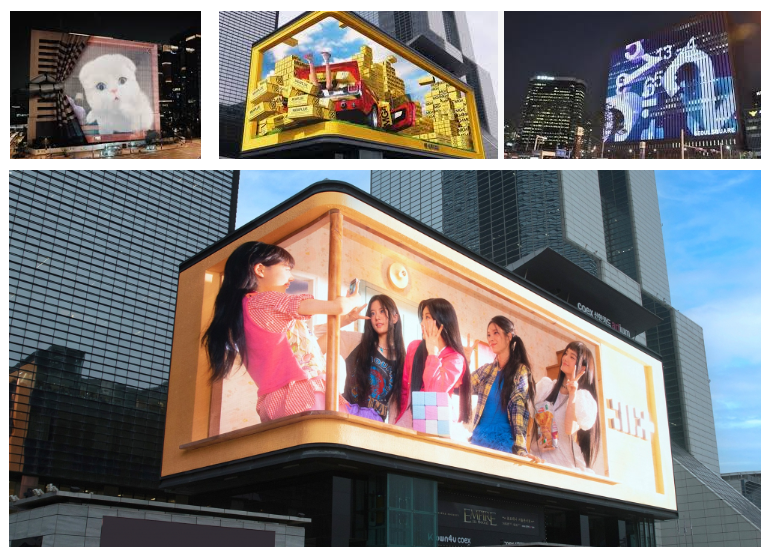 토이시티 같은 많은 건물들 중 유독 눈에 띄는 현대식 건물의 외벽을 활용한 미디어 파사드 광고는 건물의 정면이 있는 외벽을 의미하는 파사드공간을 디스플레이로 활용한 광고를 말한다. 아래 영상과 같이 L 자와같은 곡면에 표현하는 아나몰픽 일루전( 3d Anamorphic illusion ) 기법을 알아 두자.