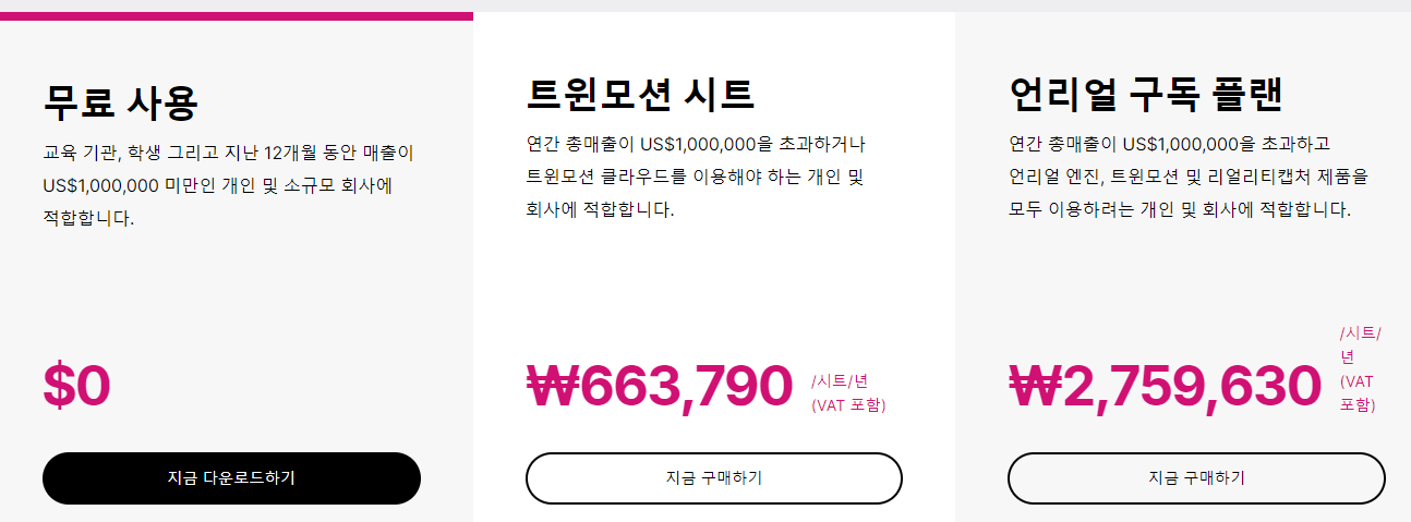트윈모션은 USS 1,000,000미만의 개인 및 소규모회사는 무료로 사용할 수 있습니다. 1년간 USS 1,000,000 매출액이 초과하는 경우에는 구독료가 년간 663,790원입니다. 구글계정을 통한 회원가입과 휴대폰인증 등 복잡한 로그인은 필수 입니다.