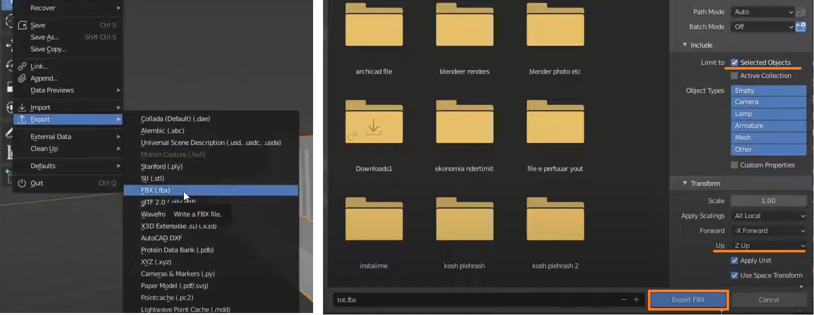블렌더에서 모델링 후 Material를 적용하지 말고 Light, Camera제거 후 순수한 모델링한 Mesh만 선택한후에 File-Export-FBX파일 내보내기를 합니다. Limited to에서 Seleted Object를 체크하고, Transform UP을 Zup을 선택해 세워진 형상으로 Export합니다.