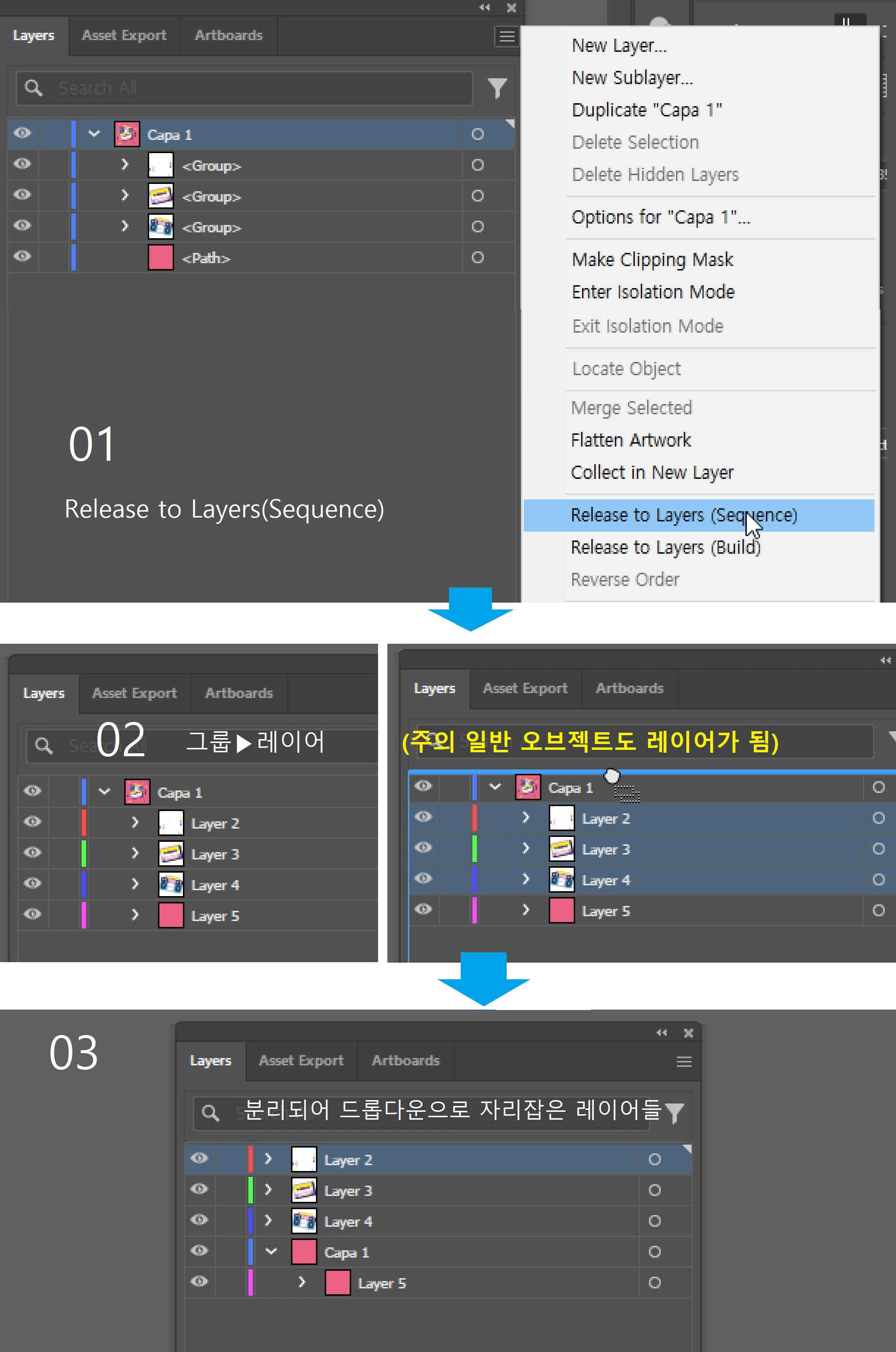 01. 우선, 레이어창을 펼치고 그룹들을 확인한다. 그리고 Layer1을 선택한 상태에서 햄버거버튼을 누르고,Release to Layer(Sequence)를 누른다.