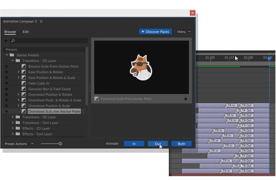 미스터호스의 애니메이션 컴포저는 프리미어 프로에 적용했던 애프터이펙트 같은 다양한 모션그래픽과 트랜지션, 효과음 등을 제공하듯이 애프터이펙트의 모션그래픽에 맞춰진 플러그 인을 설치하고 사용하는 기능입니다.
