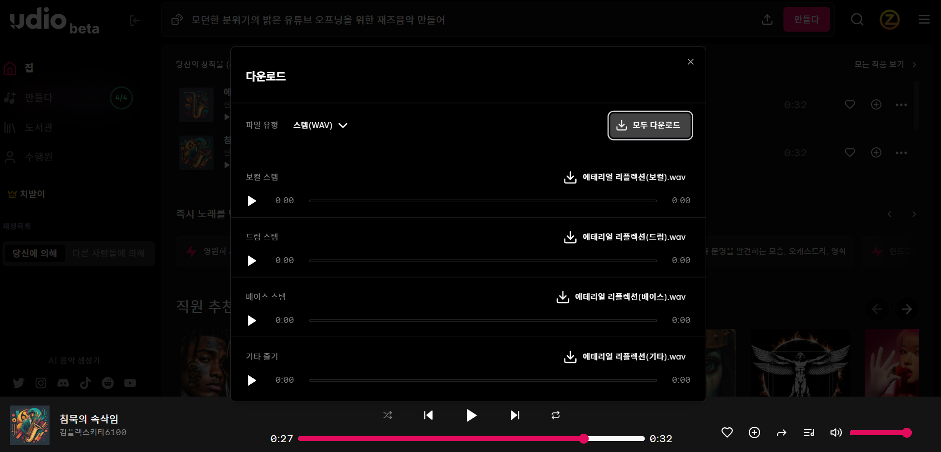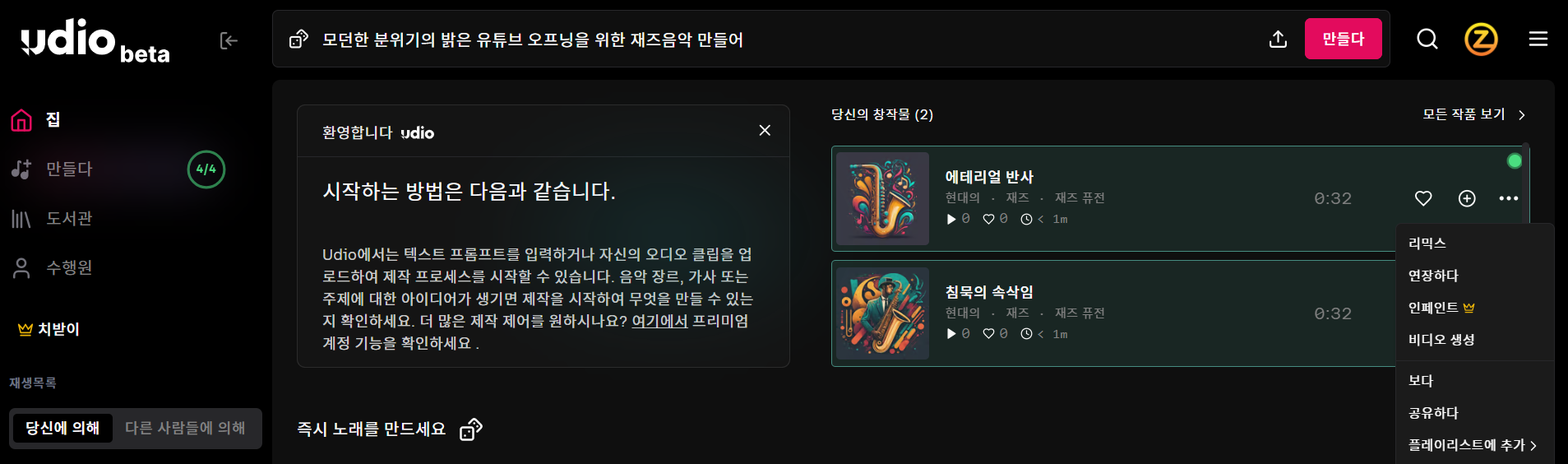프롬프트 입력 후 잠시 기다리는 시간이 필요합니다. 조금 기다리면 무료는 30초 음악을 들해줍니다. 결과물 우측의 더보기를 누르고 연장(Expand)하면 최대 약1분 30초까지 늘여서 제작지원합니다