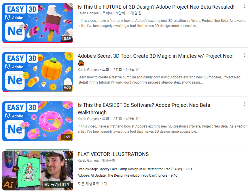 다양한 어도비 프로젝트 네오에 관련된 튜토리얼을 유튜브검색을 통해서 찾을 수 있습니다.