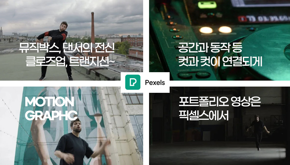 본인이 촬영한 푸티지 소스를 이용하면 더 좋습니다. 이런 푸티지가 없다면 Pixels를 추천합니다. 아래는 'dance'라는 검색어로 검색한 결과의 링크입니다. 뮤직박스, 댄서의 전신 클로즈업, 트랜지션을 공간과 동작 등 컷과 컷이 연결되게하고, 텍스트와 선, 도형등의 모션그래픽의 조합, 당연히 빠질 수 없는 BGM을 잘 선정해서 하나의 멋진 영상으로 조합한 장면들도 쉽게 만들 수 있는 포트폴리오 전용 작품이 될 수 있습니다.
