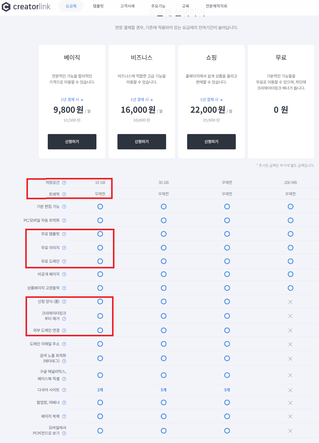 Creatorlink의 템플릿을 활용한 요금제 중 베이직 1년 결제시 9800원이면 월817원이며 하단에 푸터배너 제거, 저장공간 10gb용량, 트래픽 무제한, Contact의 작성가능한 양식 폼 제공, 무료도메인 id.creatorlink.net 등의 조건에서 개인용 포트폴리오 소개 및 1인창업 등 비즈니스 측면에서 좋은 조건에 웹사이트로 좋은 조건입니다.