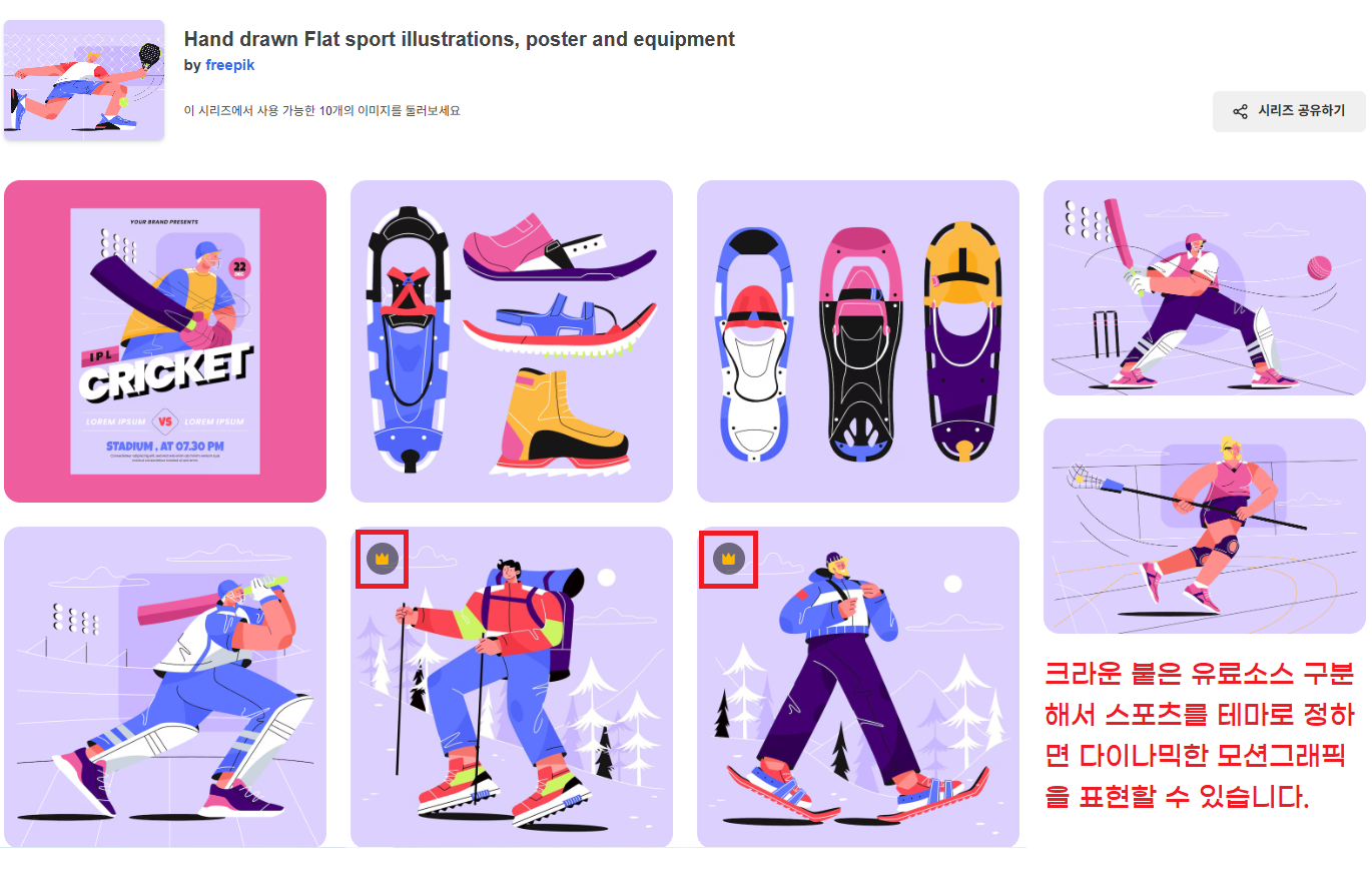 ▲ 위 크라운 붙은 유료소스 구분해서 스포츠를 테마로 정하면 다이나믹한 모션그래픽을 표현할 수 있습니다.