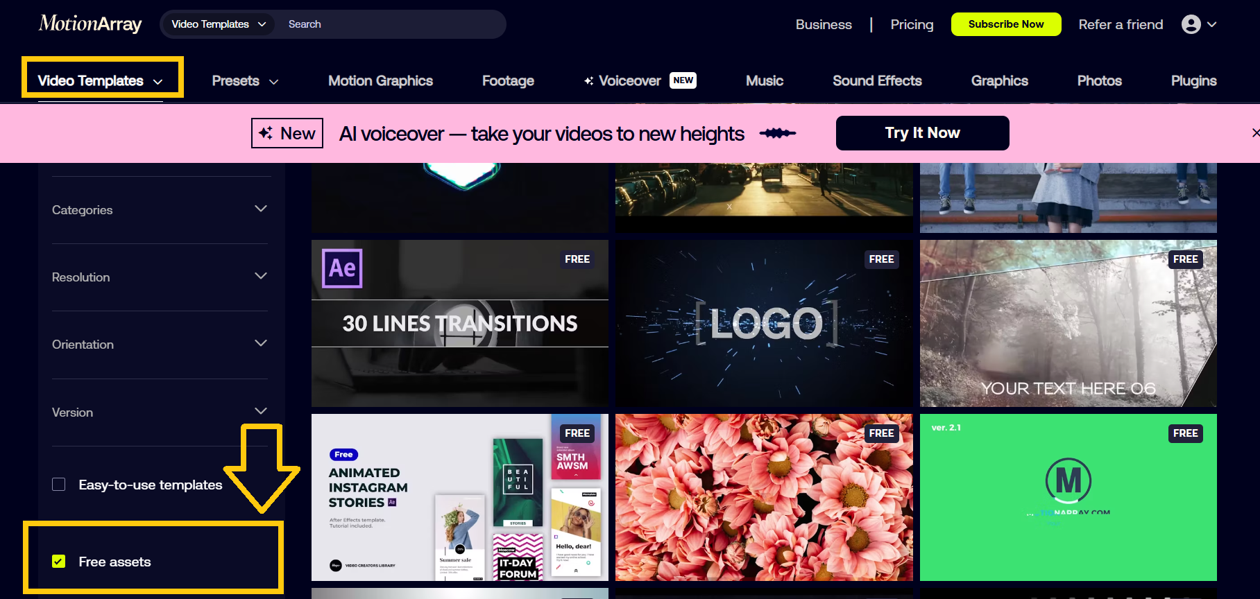 구글계정이 있다면 회원가입하고 프로의 영상작품 결과물인 프리미어 프로, 애프터이펙트의 플러그인 없는 원본 프로젝트 파일을 검색 후 Free 체크하여 구해서 쉽게 포트폴리오를 제작할 수 있습니다.