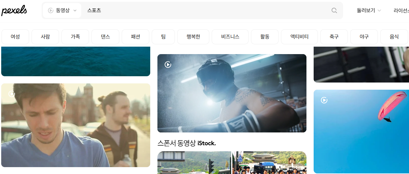모션그래픽에비디오가 빠지면 안되겠죠? MP4 Video Footage는 Pexals가 다이나믹한 비디오 소스가 많습니다. 아래는 '스포츠'를 한국말로 키워드 입력한 검색결과 입니다. 주제어를 입력하고 검색해서 영상편집의 기본영상으로 활용해야 작품이 됩니다.