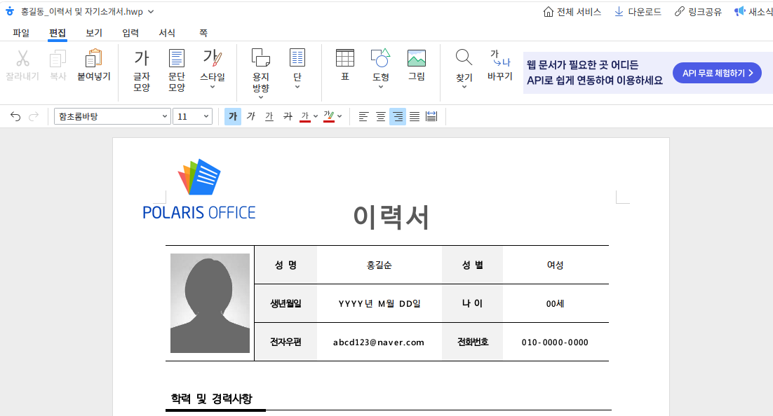 이력서와 자기소개서는 ▼ 아래 양식을 참고하시며 한컴오피스가 설치가 안된 경우는 폴라리스 오피스 웹으로 다운로드한 문서를 한글문서 편집을 하고 저장할 수 있으니 활용하세요. 그리고 잡코리아, 사람인 등 구직 사이트 자체 폼으로도 대체해 입력 후 제출하는 경우도 있으니 알아두세요.