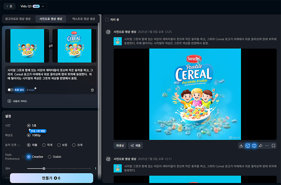 시리얼박스속 세상에 없는 브렌드를 추출해 시작-종료 이미지 2장을 업로드 후 프롬프트에 입력한 결과 장면전환을 표현했다. 일러스트 그림이지만, 어린이 캐릭터들도 동작을 한다.