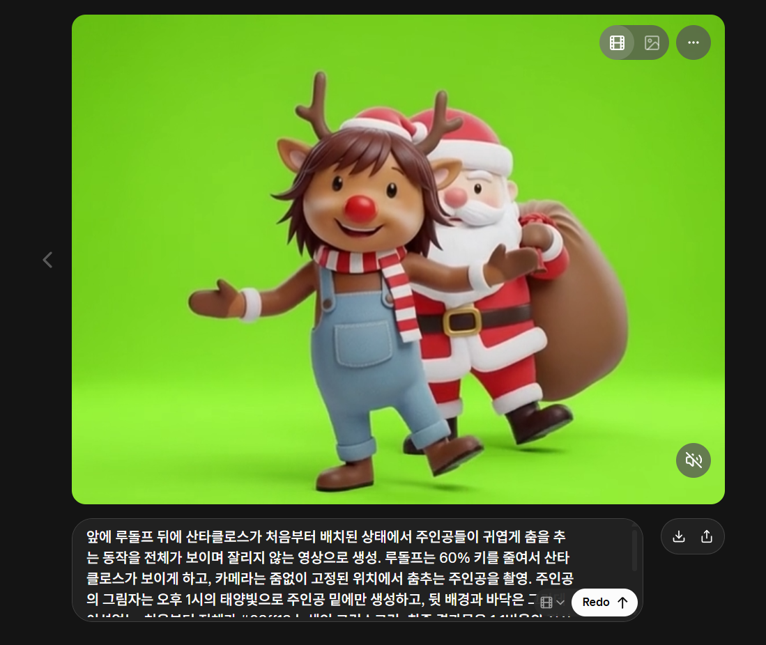 "앞에 루돌프 뒤에 산타클로스가 처음부터 배치된 상태에서 주인공들이 귀엽게 춤을 추는 동작을 전체가 보이며 잘리지 않는 영상으로 생성. 루돌프는 60% 키를 줄여서 산타클로스가 보이게 하고, 카메라는 줌없이 고정된 위치에서 춤추는 주인공을 촬영. 주인공의 그림자는 오후 1시의 태양빛으로 주인공 밑에만 생성하고, 뒷 배경과 바닥은 그라데이션없는 처음부터 전체가 #03ff13 녹색인 그린스크린, 최종 결과물은 1:1비율의 정사각형 비율 가로와세로 1440px크기, 영상의 안쪽여백을 주인공의 몸과 동작이 잘려보이지 않게 고려해 안전여백은 100px, MP4로 렌더링해줘."