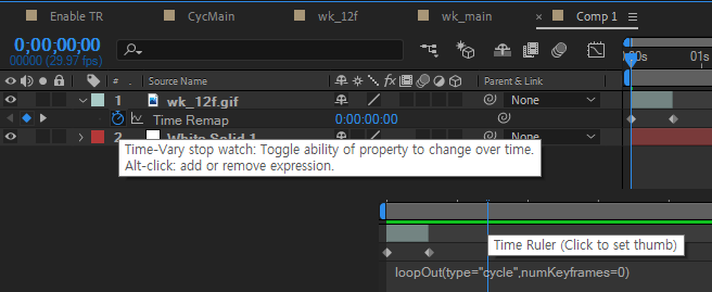 01. GIF파일 혹은 짧은 Duration의 콤프가 있는 레이어를 선택하고 우클릭(RMB)후에 명령 중 Time-Enable Time Remapping 혹은 단축키CA+T눌러시간을 변용할 기능을 추가해줍니다.