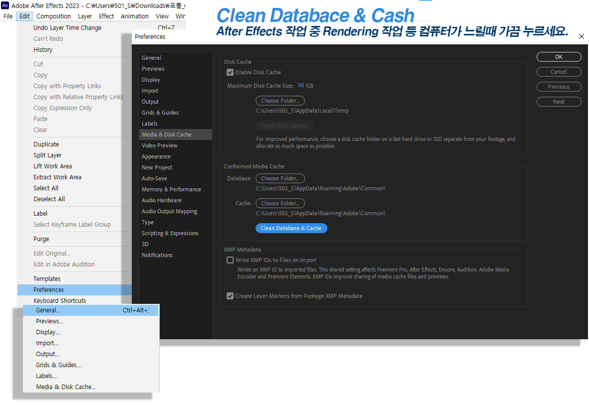 After Effects 작업 중 Rendering 작업 등 컴퓨터가 느릴때 Edit -Preferences - Media & Disk Cashes에서 Clean Databace & Cash를 가끔 누르세요.