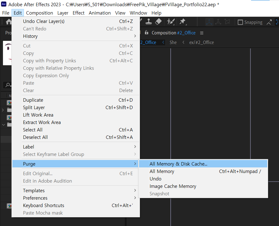 애프터이펙트에서 모션그래픽 작업시 Space bar로 재생하는 렌더링 과정에서 렉이 걸릴 때Edit-Purge-All Memory & Disk Cash를 지우는 것도 추천한다.