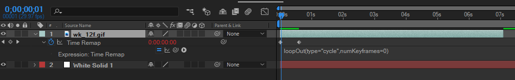 03. Enable Time Remapping 처리 후 스톱워치 아이콘을 Alt키를 누르며 클릭한 후, 기본값을 지우고 표현식으로 아래와 같이 입력을 해주면 된다. 짧게 loopOut() 길게는 loopOut(type="cycle",numKeyframes=0)짧고 길든 루프아웃은 같은 반복된 결과를 얻게 됩니다.