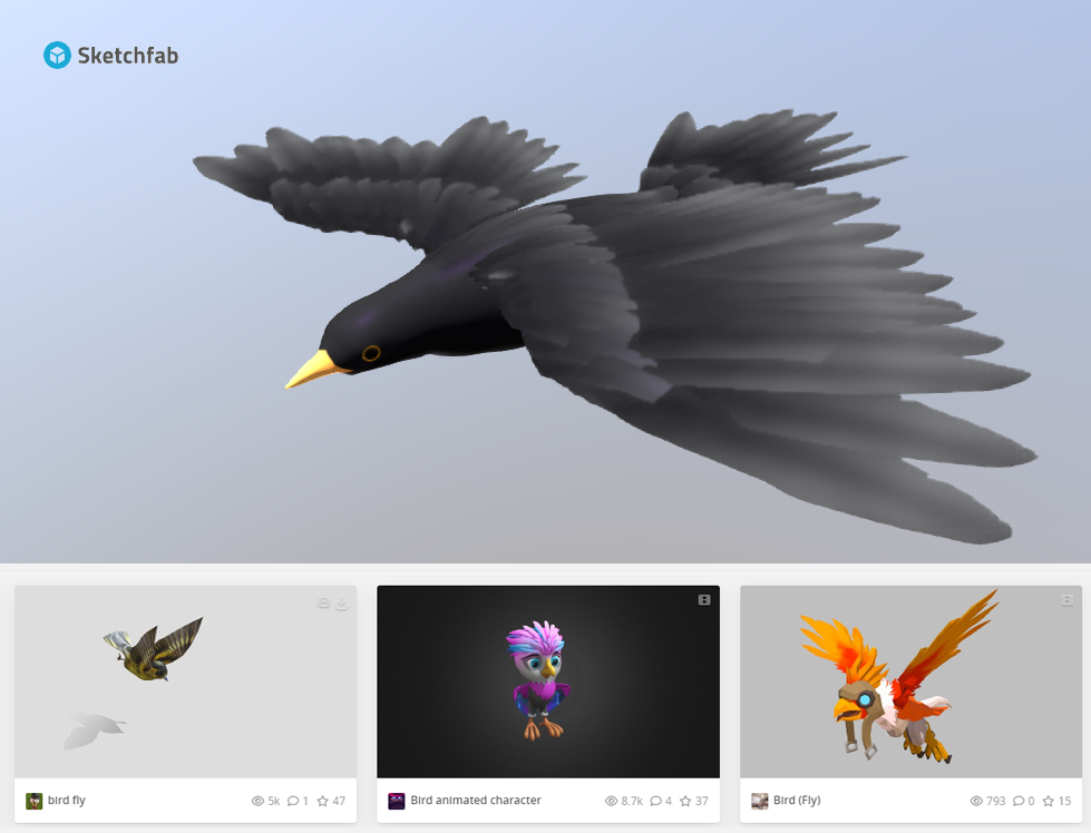 이번에 소개하는 내용은 2D의 동작표현을 위한 방법이라는 점에는 제한이 있습니다. 나는 새를 예를 들어보면 2D의 한계가 있어서 옆에서 나는 장면 밖에 표현을 못합니다. 아래 Sketchfab의 경우는 360도 어떤 각도에서도 나는 새의 장면을 묘사할 수 있지만 2D는 앞모습, 뒷모습, 옆모습을 직접 그려가야 합니다.