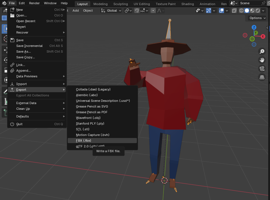 01. 블렌더에서 모델링 후 내보낼 Object만 남기고 지운 후 File - Export -FBX 메뉴를 누른다.