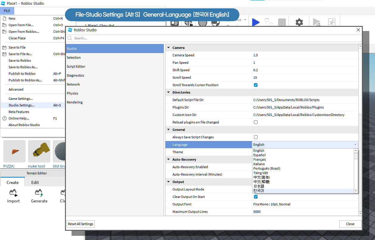 File-Studio Settings [Alt S] General-Language [한국어 English]