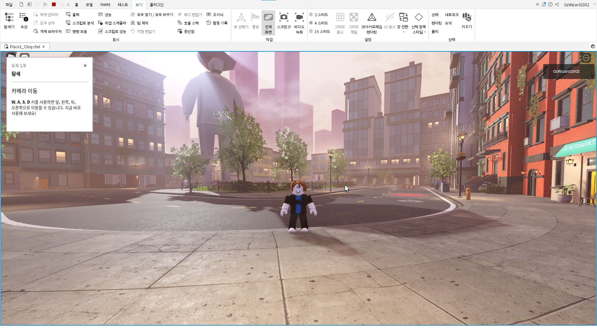 02. Roblox Studio를 실행하고 가상의 스튜디오에 ■ 기본 정지버튼으로 되어있고 중앙에 3D가져오기로 가져온 FBX모델이 회색의 기본색상으로 거대하게 위치해서 크기와 회전을 주고 배치를 조절했다. 비스듬한 곳은 넘어질 수 있어 평평한 면의 바닥에 위치시켰다.