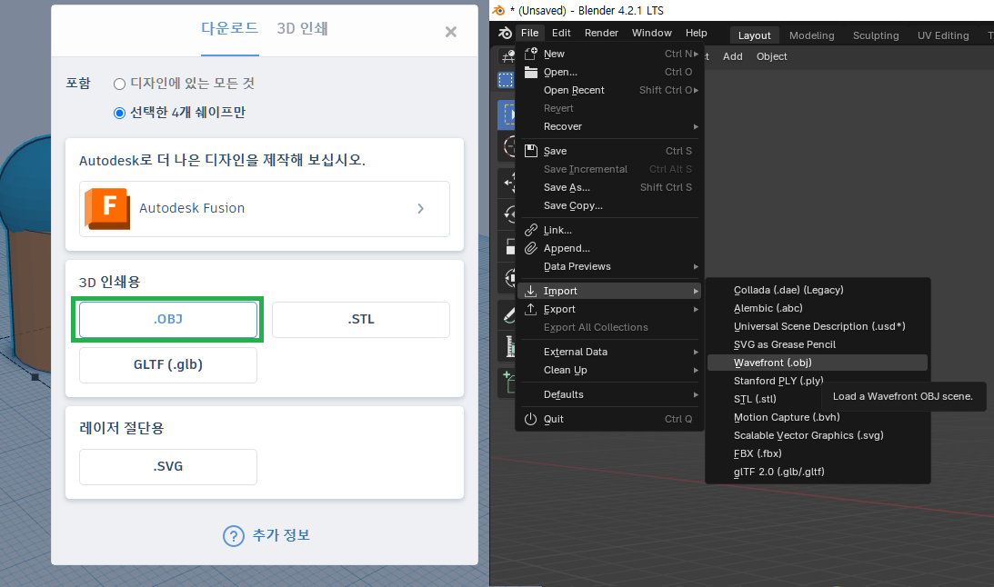 팅커캐드에서 내보내기로 3D 인쇄용 OBJ파일로 내보기를 해줍니다. OBJ파일은 블렌더 뿐만 아니라 마야, C4D와 같은 3D응용프로그램에서 모두 가져오고, 또 내보낼 수 있는 표준 호환되는 3D 모델파일입니다.