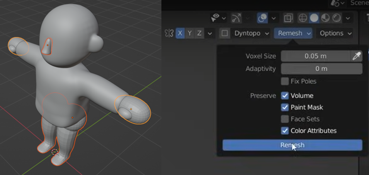 전혀 별개인 신체의 일부로 Sculpting에서 Remesh가 필요하다. Modifier의 Remesh와는 조금 다른 성격이다.