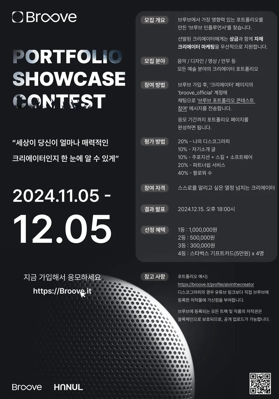 비트코인처럼 가상토큰 NFT를 기반으로 한 브루브에서 2024.12.05까지 음악 / 디자인 / 영상 / 안무 등 모든 예술 분야의 크리에이터의 포트폴리오를 선정해서 1등 : 100만원- 2등 : 50만원- 3등 : 30만원의 상장과 상금이 수여됩니다. 공모전참여를 위한 가상회폐인 NFT 등의 선투자가 필요한 내용이라 가입 및 이용절차 자세한 공모전 내용은 아래 정보를 참고하세요.