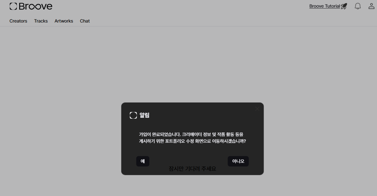 가입이 완료되었습니다. 크리에이터 정보 및 작품 활동 등을 게시하기 위한 포트폴리오 수정 화면으로 이동하시겠습니까? 라고 화면에 뜨며 '예'를 누르고 이동해보았습니다.